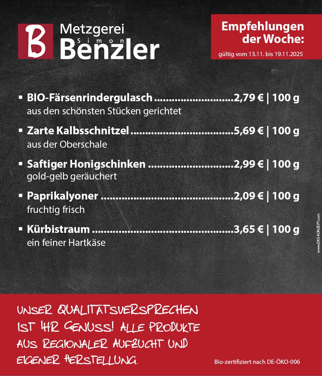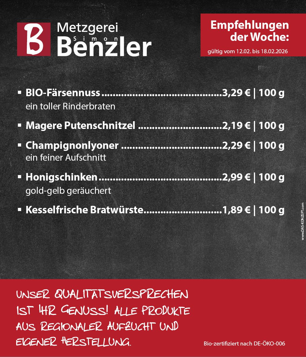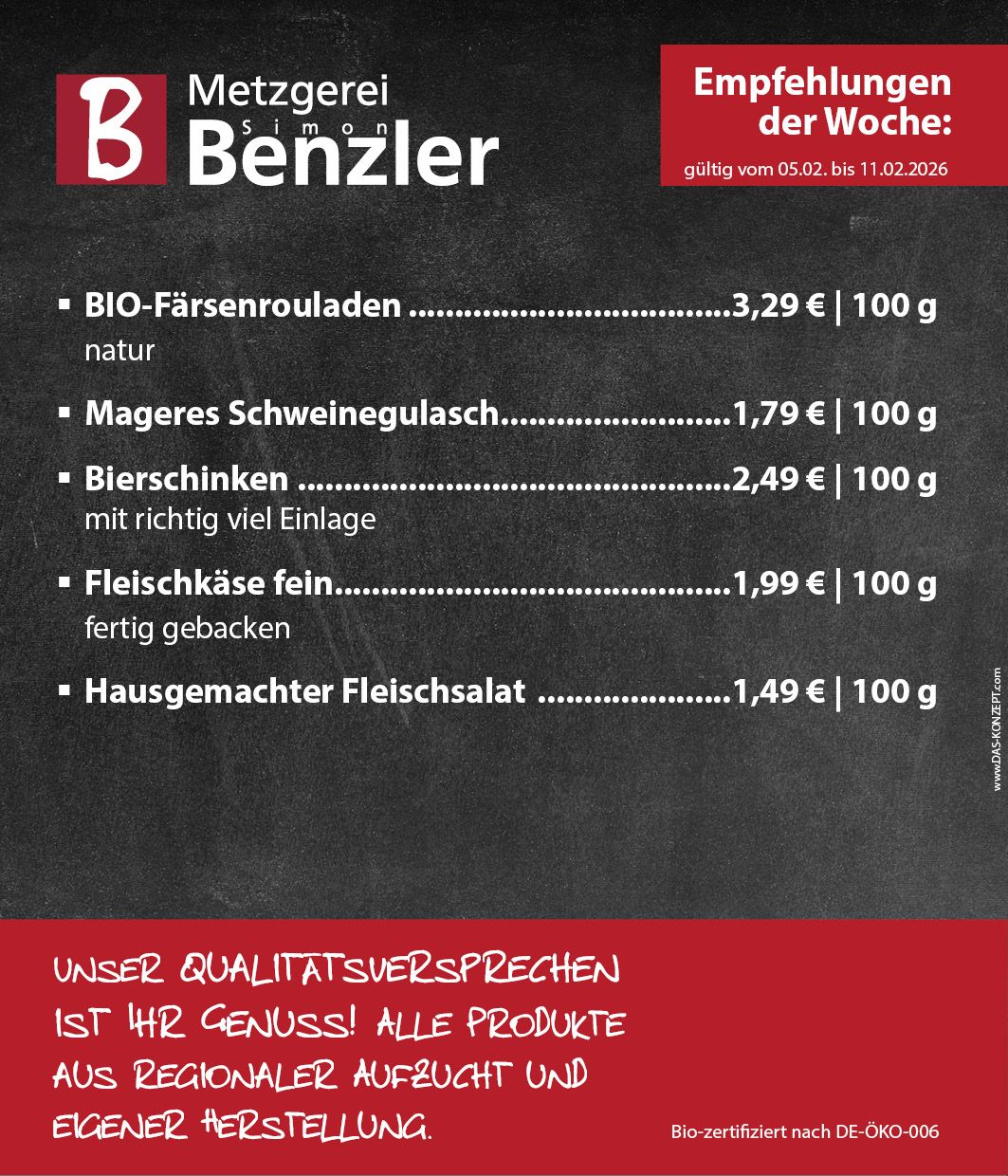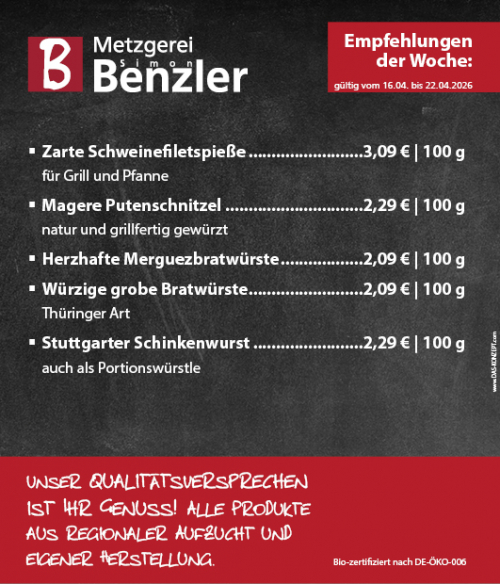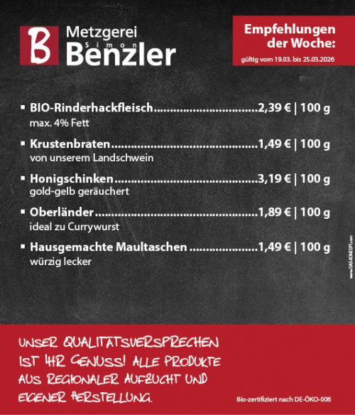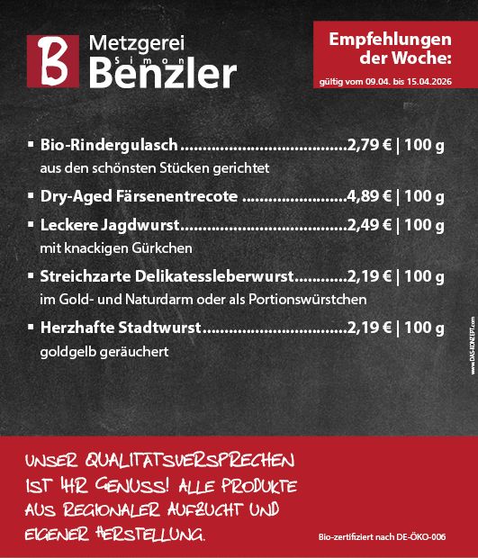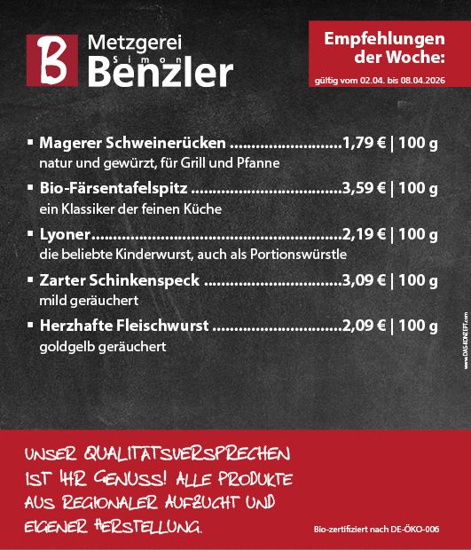 Seit 1980 steht die Metzgerei Benzler für höchste Qualität und handwerkliche Spezialitäten aus eigener Herstellung. Fleisch, welches Sie mit gutem Gewissen genießen können – das ist unser Anspruch.